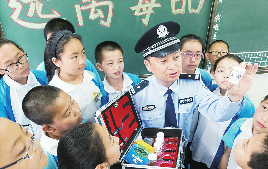 6月22日,辽宁省辽阳市公安局宏伟分局禁毒大队民警在辖区小学开展禁毒宣传活动。 刘谦 摄