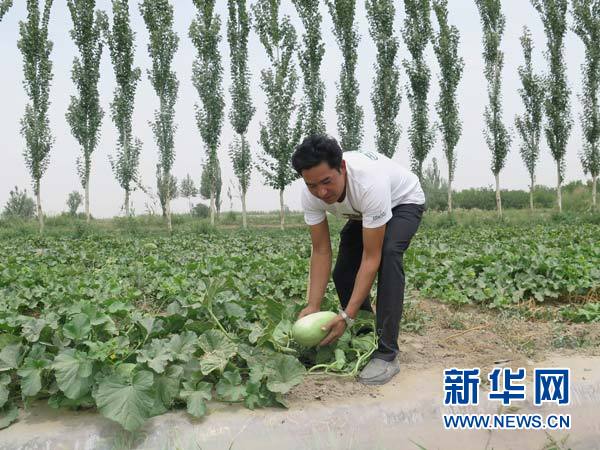6月14日,在新疆巴楚县英吾斯塘乡,玉素甫·热合曼在自家瓜地劳作。新华社记者 孙少雄 摄