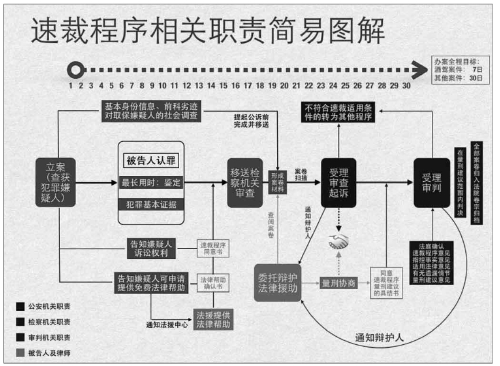 “单是设立速裁办这一项,就大大缩短了办案的时空距离,加快了案件在公检法之间的流转速度。”海淀区检察院公诉二处副处长、速裁办组长李刚介绍,更为重要的是,还进一步简化了刑事诉讼法规定的相关诉讼程序,诉讼效率从而得到极大提高。简化诉讼程序主要包括以下几项:一是简化案卷流转。案卷不再通过案管部门流转,而是直接在各办案机关的速裁办、速裁法庭间流转。二是简化办案流程。取保候审案件,审查起诉阶段沿用公安机关的取保候审手续与期限,不再办理续保手续;羁押案件,不再换押,办案人只需在提押证上签章备注;赃物由公安机关统一保管,案件流转时“转单不转物”;简化提讯程序,提讯时先确认被提讯人是否自愿同意适用速裁程序:让其填写“刑事速裁程序权利、义务告知书”和“量刑协商确认书”等,然后让其阅读公安机关制作的起诉意见书,直接讯问其对起诉意见书指控的犯罪事实与罪名是否有异议,并记录在案,省略身份记录、交代犯罪事实等常规内容。三是简化案件审结报告。案件审结报告直接对证据证明内容进行说明,其中,格式化案件审查报告直接记录是否有无该证据。目前,对于危险驾驶、贩卖毒品等常见且证据较为固定的案件,该院统一使用表格化的案件审结报告。