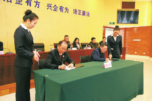 图为11月30日,四川省检察院检委会专职委员谭炳社(左)与四川机场建设集团有限公司总经理潘刚军签署《意见》