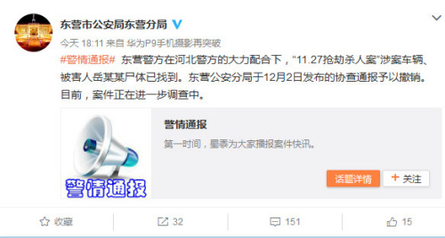 据山东省东营市东营公安分局官方微博消息,东营警方在河北警方的大力配合下,“11.27抢劫杀人案”涉案车辆、被害人岳某某尸体已找到。目前,案件正在进一步调查中。