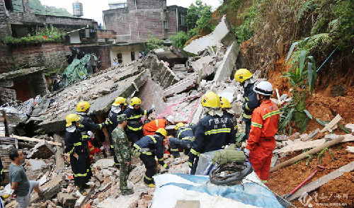 梧州市消防支队先后调派苍梧中队、特勤中队、搜救犬队共计46名官兵、3条搜救犬、10辆消防车赶赴现场。
