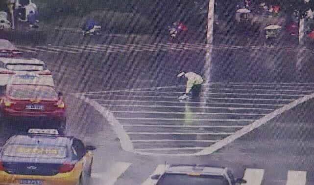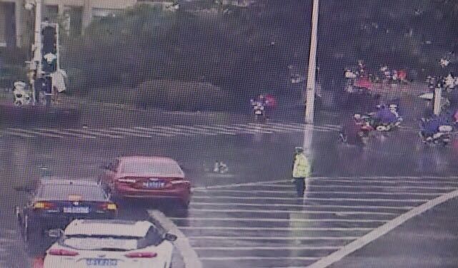 当日上午8时30分左右,天空中下着大雨,又赶上早班车流量高峰期,道路变得拥堵。安徽省芜湖市公安局交警支队镜湖大队协警翟羽佳正在北京东路与文化路路口指挥交通时,一位路过热心司机,见他头部、裤腿直至两脚湿透,乘停车等红路灯间隙快速下车,并从车上找到一把雨伞抛给小翟遮挡风雨,这一幕刚好被路口监控拍下,让大家看了非常感动。