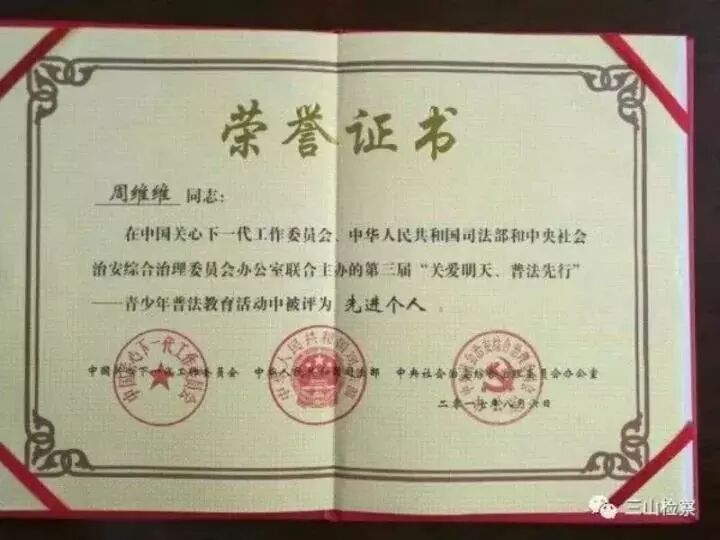 今年8月,她被中国关工委、司法部、中央综治办联合表彰为全国第三届“关爱明天、普法先行”青少年普法教育活动先进个人。