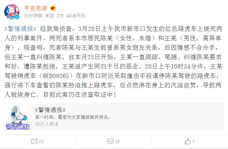 经芜湖市公安局侦查:3月28日上午芜湖市新市口发生的红色路虎车上烧死两人的刑事案件,两死者系本市居民陈某(女性,未婚)和王某(男性,离异单身)。现查明,死者陈某与王某生前曾系男女朋友关系,后因情感不合分手,但王某一直纠缠陈某。自本月25日开始,王某一直跟踪、尾随、纠缠陈某要求和好,遭陈某拒绝,王某遂产生同归于尽的恶念。28日上午10时54分许,王某驾驶瑞虎车(皖B09265)在新市口附近采取撞击手段逼停陈某驾驶的路虎车,强行将下车查看的陈某胁迫推上路虎车,后点燃淋在身上的汽油自焚,导致两人被烧身亡。目前此案仍在侦查取证中!