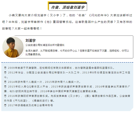 刘鉴宇说咱们公安青年一个很庞大的群体,可是写公安题材的歌曲却少之又少。他就想多写一些咱们自己的歌,唱一唱咱们新时代的公安青年的故事。