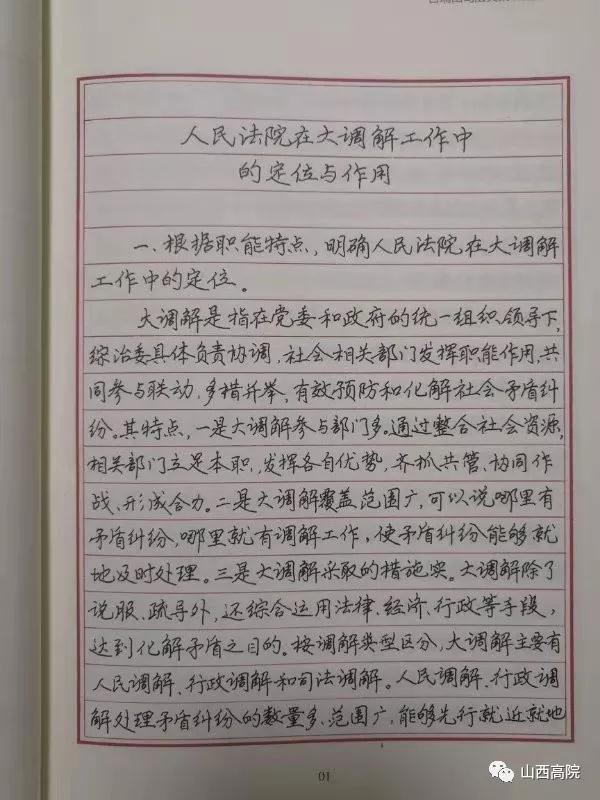 山西省高院退休法官吉瑞田以书法创作的形式,分别将自己从业期间发表的10篇法律论文和《中共中央关于全面推进依法治国若干重大问题的决定》(以下简称《决定》)书写下来结集出版,其中,《决定》百米长卷被中国法院博物馆收藏。