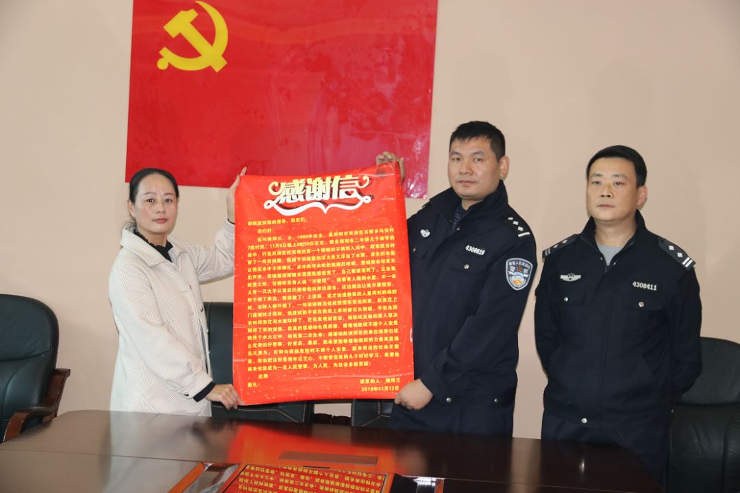 姚辉兰满怀感激地将感谢信和锦旗送到杨胜斌的手中。