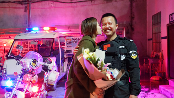 当晚,城区武装巡逻大队警务助理轮值轮训驻地警灯闪烁,警务助理着装整齐,点亮蜡烛,花瓣满地,气氛温馨,随着巡逻车内扩音器喊出的“你已经被爱包围,请放弃抵抗,接受告白......”一场浪漫的求婚仪式拉开序幕。