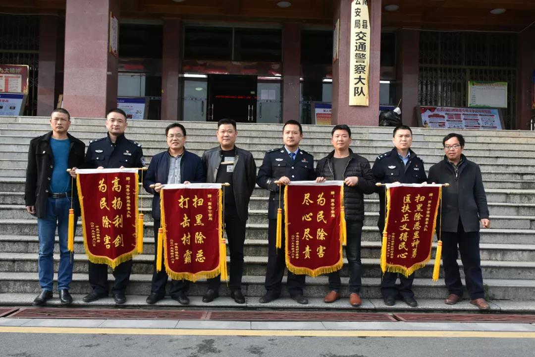 ▲中鱼口镇政府和常北村村委会向南县公安局赠予“扫黑除恶、打击村霸”等四面锦旗。