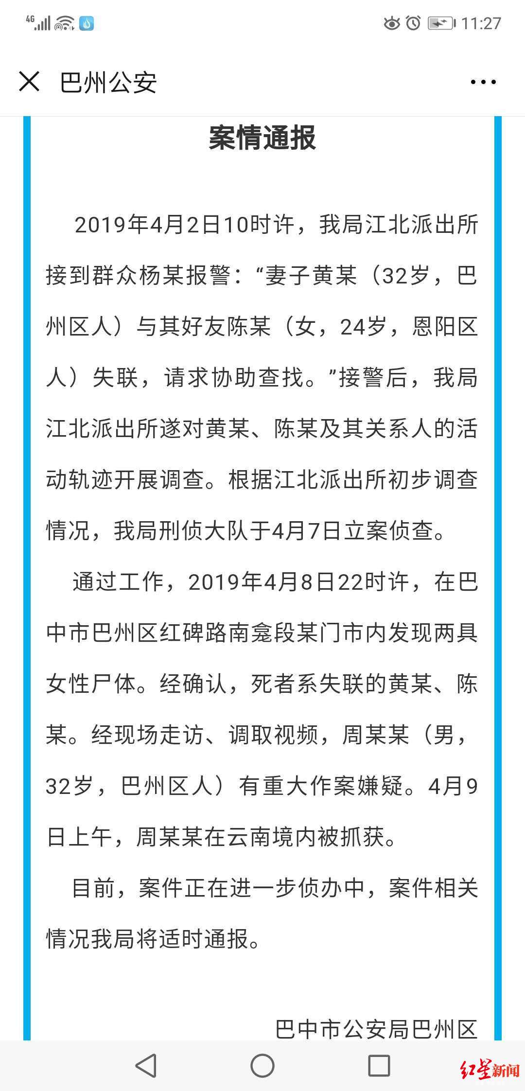 4月9日上午,两名女子遗体已在巴中市殡仪馆尸检,随后,红星新闻记者从巴中公安局巴州区分局获悉,犯罪嫌疑人已经在云南境内被警方抓获。