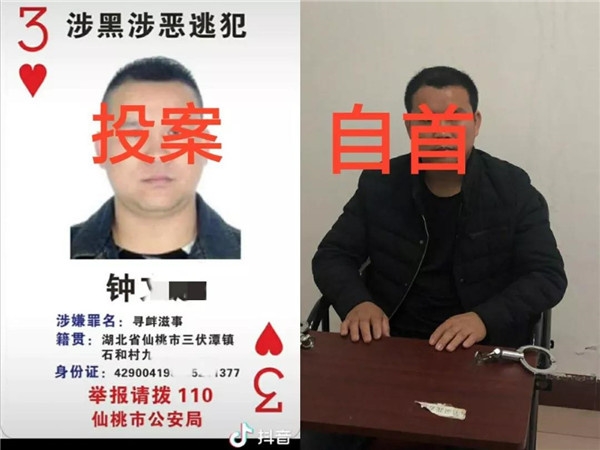 “我在抖音上刷到自己,亲戚朋友也在网上看到了,他们就劝我来投案自首,争取法律宽大处理。”4月18日,涉嫌寻衅滋事的网上逃犯钟某到仙桃市公安局三伏潭派出所投案自首。
