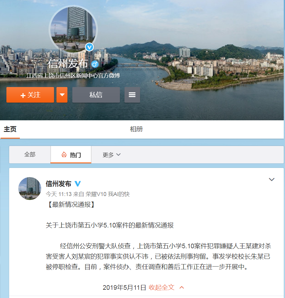 关于上饶市第五小学5.10案件的最新情况通报