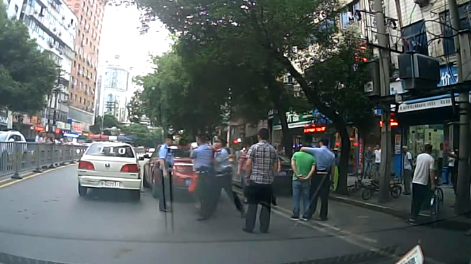 民警一边尝试控制嫌疑车辆,一边提醒周边车辆和行人赶快避让