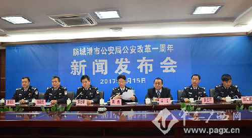 2月15日,广西壮族自治区防城港市公安局召开该市公安“大部门制”改革一周年新闻发布会,向媒体通报公安改革一年来所取得的成效。