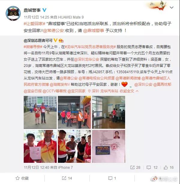 11月12日,@常德公安 德叔收到一条来自@深圳志愿者可可微博求助信息:一位疑似精神有问题并带着婴儿的女子向龙华汽车站党员志愿者服务岗求助回家。