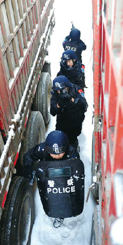 特警队员在大货车之间进行搜索演练。