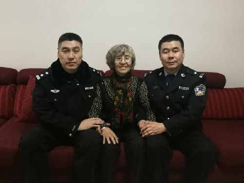 警察儿子李凯(左一)、李浩牵着母亲王桂芝的手留影