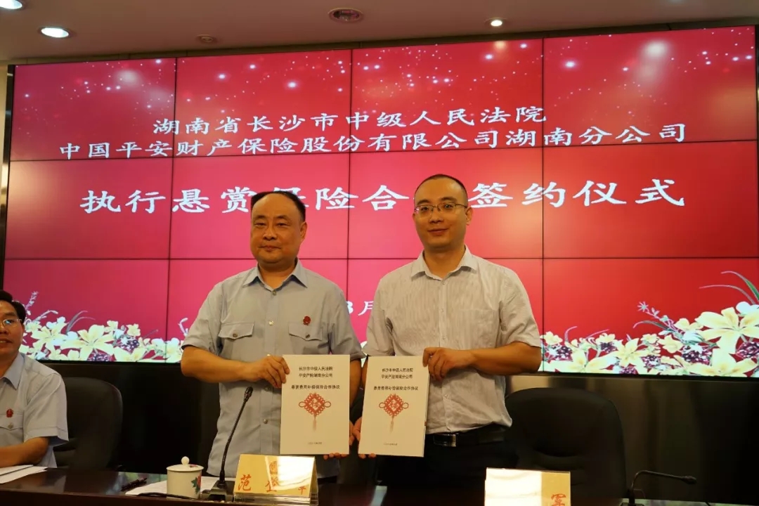 长沙中院党组成员、执行局长范登峰分别与中国人民财产保险股份有限公司湖南省分公司党组成员、副总经理兼长沙市分公司总经理廖文常、中国平安财产保险股份有限公司湖南分公司责任险业务部经理赵军签订了执行悬赏保险合作协议。