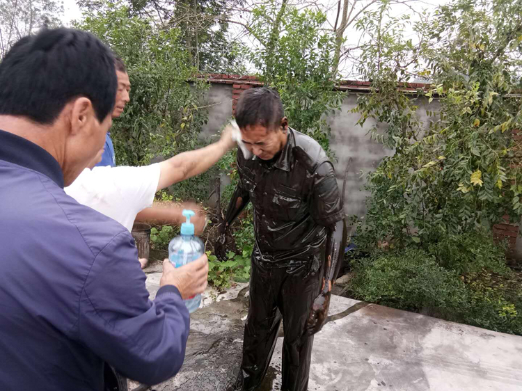 同事将浑身漆黑的黎明救起后,看着黎明的样子,有些忍俊不禁。拿出手机拍下了当时一幕。照片和视频显示:几个人围着一个满身油污的年轻男子,浑身漆黑的子正在擦拭着身上的油污,一旁还有人拿着洗洁精在帮忙清洗。男子甚至连耳朵鼻子都被灌满了油污。