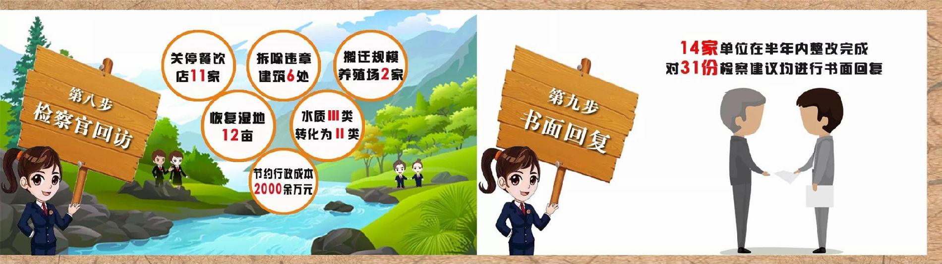 31份检察建议,督促14家行政执法部门及4个乡镇,用半年时间改善供50万人生活的5300万立方米蓄水水质,水质从Ⅲ类转成了Ⅱ类。