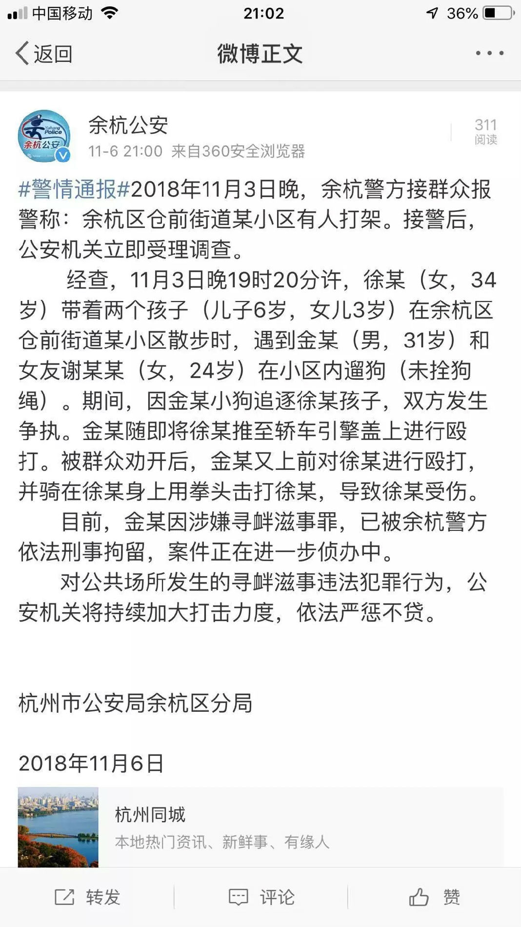 经查,11月3日晚19时20分许,徐某(女,34岁)带着两个孩子(儿子6岁,女儿3岁)在余杭区仓前街道某小区散步时,遇到金某(男,31岁)和女友谢某某(女,24岁)在小区内遛狗(未拴狗绳)。期间,因金某小狗追逐徐某孩子,双方发生争执。金某随即将徐某推至轿车引擎盖上进行殴打。被群众劝开后,金某又上前对徐某进行殴打,并骑在徐某身上用拳头击打徐某,导致徐某受伤。