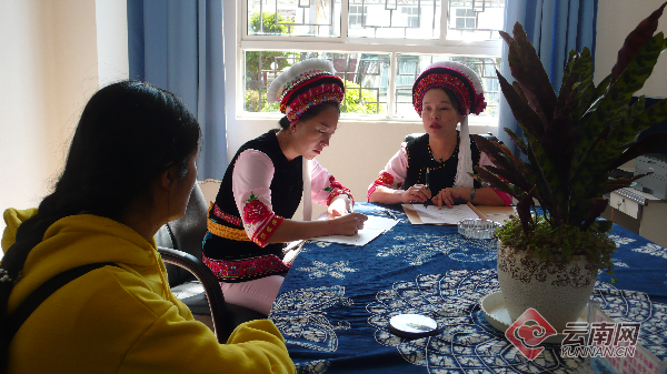 11月19日中午,大理市法院喜洲法庭来了一对打离婚官司的小夫妻。法庭的两位“金花调解员”用白族话与他们交谈,耐心地倾听他们的诉说,对他们进行庭前调解。恰逢“见证——改革开放40年云南法治建设发展印记”采访团的记者们来到喜洲法庭,亲眼见证了两位“金花调解员”的调解工作。