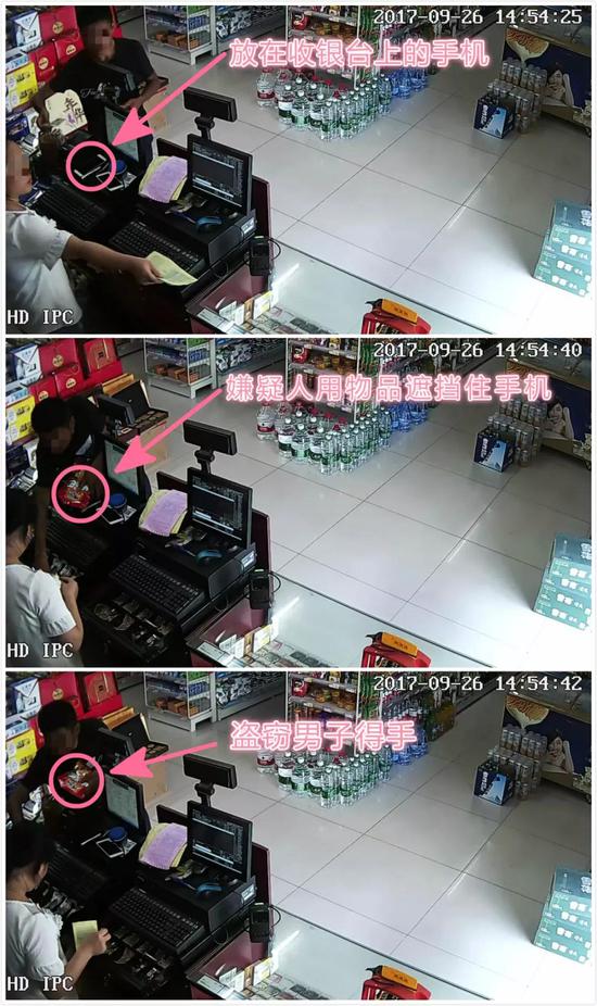 ▲盗窃者以找零为由分散受害人注意力,用物品遮挡后快速盗走手机。(监控截图)
