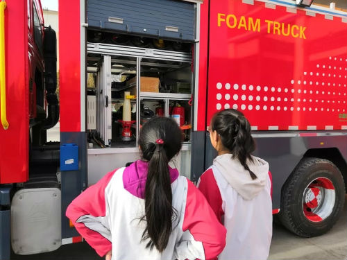 在阿克苏市水韵中队,张玥和王芳大开眼界,她们参观了中队的荣誉室、消防员叔叔们的寝室和各种消防设备,还坐了一次消防车。