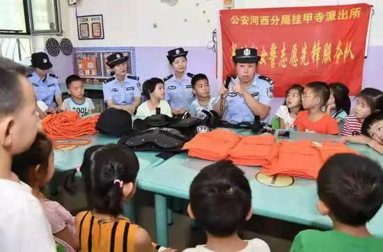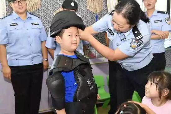 2018年9月,服务队来到河西二幼,带去了各种警用装备,让孩子们大开眼界。在这里,警察有了妈妈般的温暖,不再是“不听话警察把你抓走”的冷酷形象。孩子好奇地试穿着警用装备,想象着自己神气的样子。