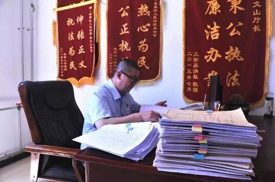 吴文山结案快是一方面,在同事们看来,他还有一股“狠”劲。这个“狠”字是刀刃向内的,是对自己狠。遇到棘手的案子,他可以几天不回家,吃住在庭里,不拿下决不收兵。