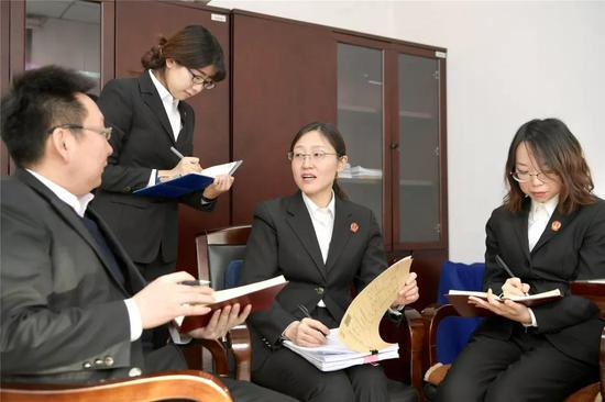 根据类型化案件需集中送达、集中审理的特点,为了提高审判效率,刘玉梅在庭里组建了“金融借款案件团队”、“物业纠纷团队”和“消费者维权案件团队”等多个专业审判团队,包干负责类型化案件的专门审理工作,打造类型案件专业化审判新模式。物业服务合同案件、消费者维权案件,均采取小额诉讼程序,一天安排六七个,甚至更多的庭审,几乎是民四庭办案法官每天的工作常态。对于同一原告、相同类型的案件,在送达、庭审、证据交换进行统一安排、统一做法,并统一裁判尺度,大大缓解了法官的审判压力,也提高了审判效率。2018年,民四庭收案7169件,审结7154件,结案数占全部民事案件的44.7%,调撤率达66.95%,审理天数从以往的40天下降为26天,成绩斐然。