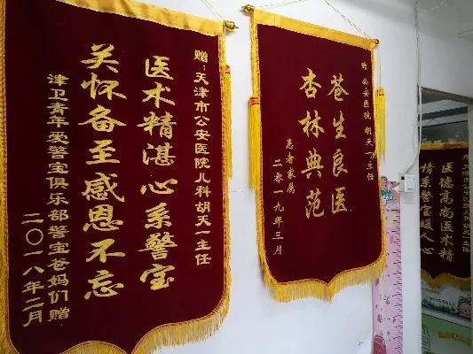 在公安医院儿科的小小诊疗室里,挂满了患者家属送来的锦旗,这些锦旗上出现最多的名字叫做胡天一。