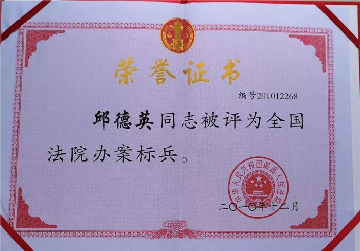 邱德英多年以来,工作勤奋,将法律的睿智、刚性和女性特有的细致、耐心、冷静和热情融合在一起,深受领导、同事以及案件当事人、律师的认可。