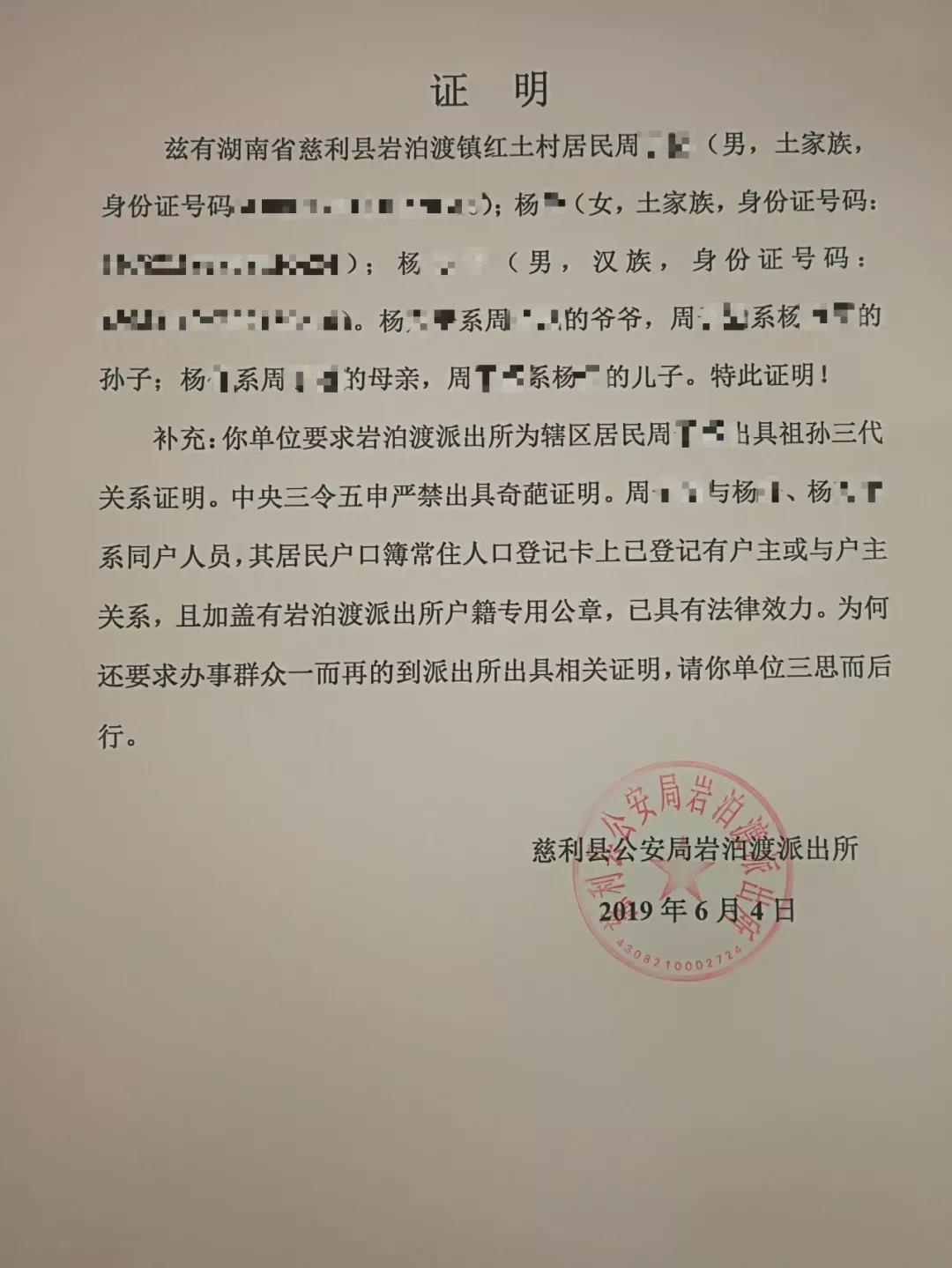 近日,湖南慈利县公安局岩泊渡派出所就被要求证明“杨某的孙子是其孙子”!