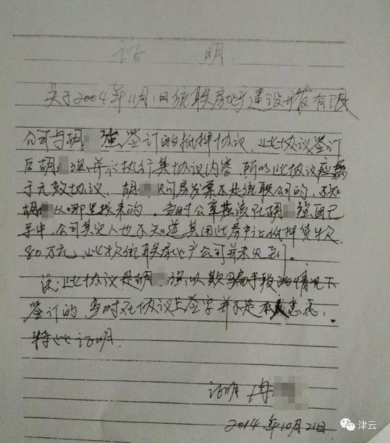 改了合同后,刘云也向统联公司出具了一份说明,证实她与唐英达成了房屋转让协议,协议上有刘云的签名,股东黄颖华的签名,以及玉川公司驻天津的股东代表王某国的签名,并加盖了公司公章。
