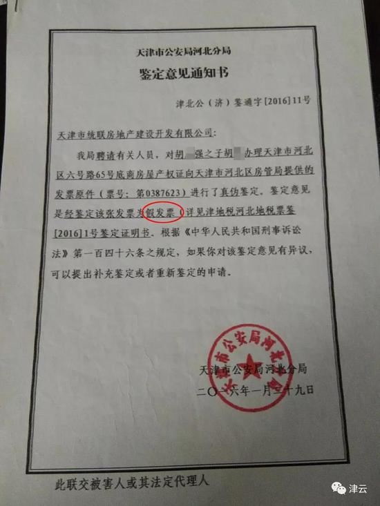 对于胡某手中的购房发票,多位证人证实这张发票并非来自统联公司,2016年,河北区公安局对这张票号为0387623的购房发票进行了鉴定,确认这是一张假发票。虽然发票是假的,但上面盖的公章却是真的。黄颖华被抄家时,公司的各种印章等都被收走,而后又回到了统联公司,多人都曾掌管过印章,其中也包括胡某强。亦有多人证实,胡某购房发票上的印章是胡某强在他家中自己盖的。
