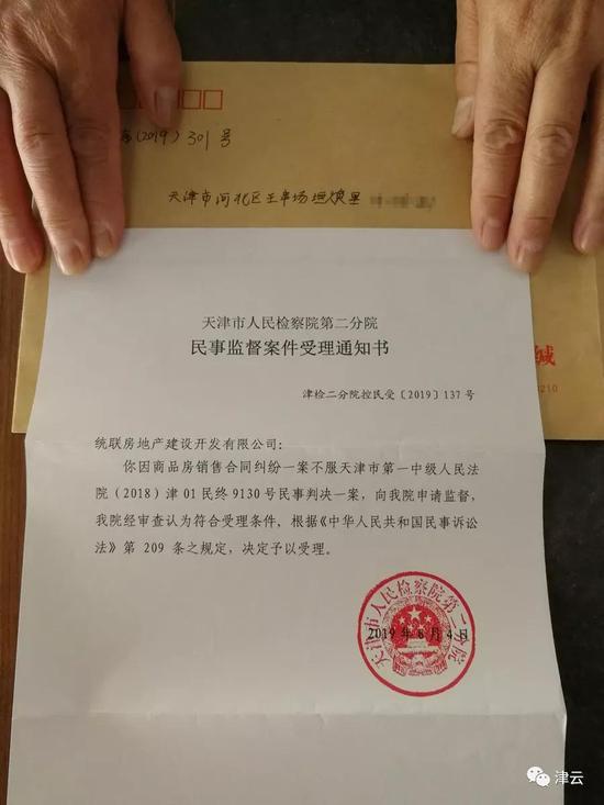 2019年6月4日,黄颖华收到天津市人民检察院第二分院的民事监督案件受理通知书,告知统联公司因商品房销售合同纠纷一案不服天津市第一中级人民法院(2018)津01民终9130号民事判决一案,经审查认为符合受理条件,予以受理。